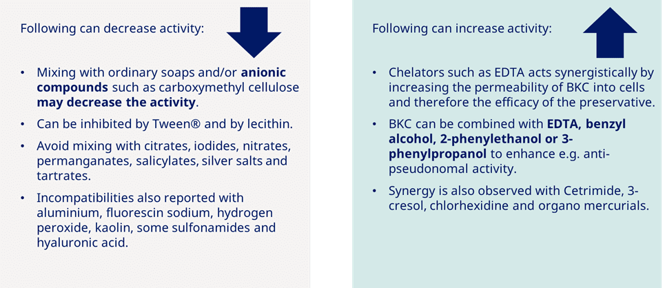 در جدول زیر اطلاعاتی درباره سازگاری و ناسازگاری بنزالکونیوم کلراید (BKC) در فرمولاسیون ارائه شده است: