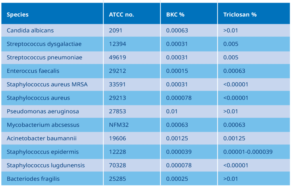 بنزالکونیوم کلراید (BKC) به اندازه تریکلوسان برای از بین بردن طیف گسترده ای از میکروارگانیسم ها مؤثر است.