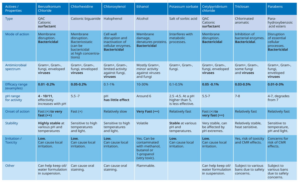 جدول زیر ویژگی های چندین ماده ضد میکروب موجود در بازار را خلاصه می کند.